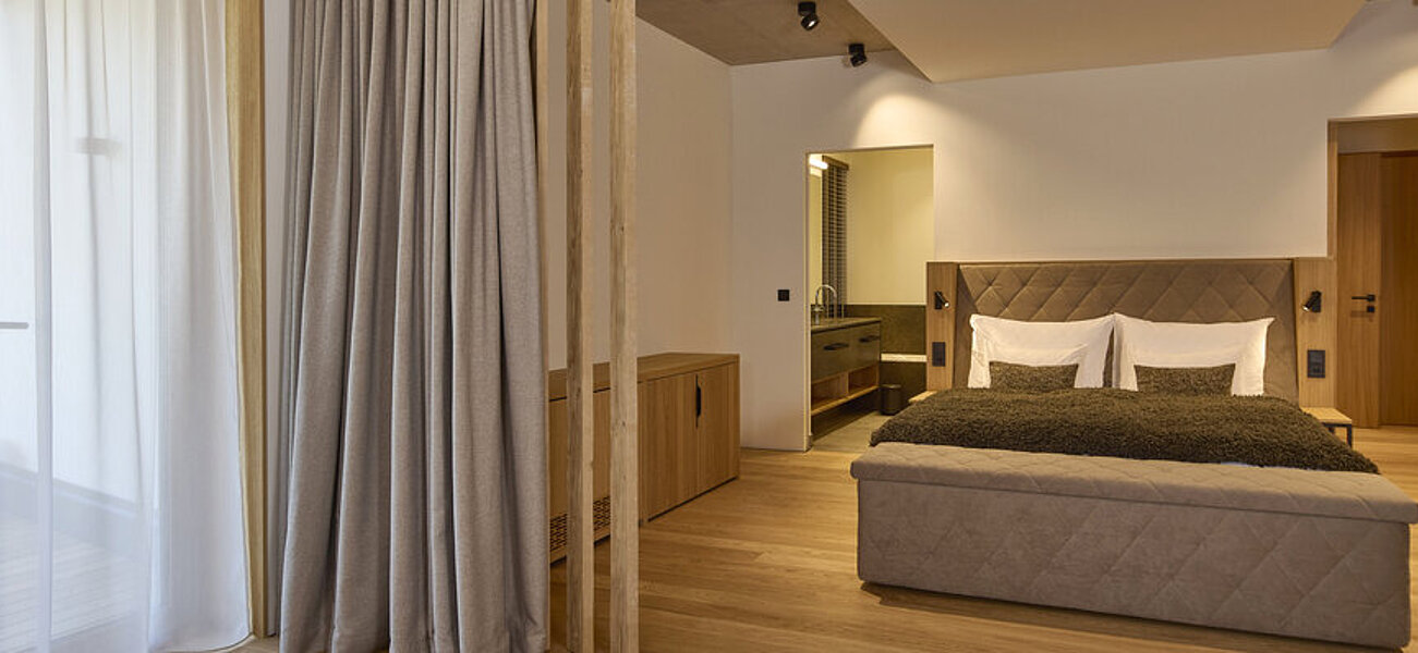 Experience our light-filled Mountain View double room as a stylish retreat for inspiring holiday moments. Elegant interiors, high-quality design and a harmonious atmosphere create a setting where you can relax and feel at home. The spacious private sun-drenched balcony, with its comfortable seating and lounging areas, offers you an unobstructed view of the impressive mountain landscape of the Kaiserwinkl. Through the large panoramic windows, you can enjoy this extraordinary view even whilst relaxing in your room.